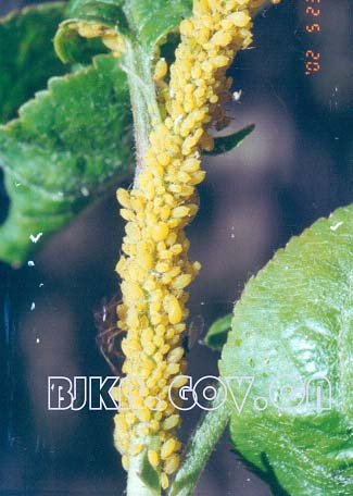 图B 沙果上的苹果黄蚜Aphis citricola (2002-5-23摄于北京西郊)。 |