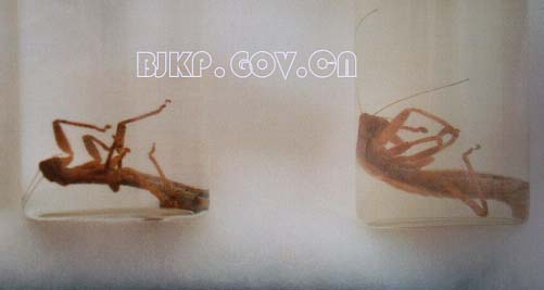 图A 一对螳(虫脩)目昆虫的浸泡标本(南非产)。
