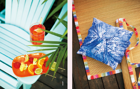 3. 鱼形茶几在座椅间摆放小茶几,让每个人都能顺手拿到饮料和甜点。这个刷成绿色的可折叠茶几给露台增添了一抹可爱的亮色。 4. 蜡染织物各种颜色的蜡染织物让人联想起马来群岛土人所穿的布裙,带来度假般的灿烂心情。