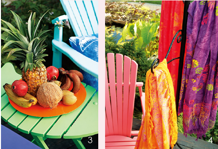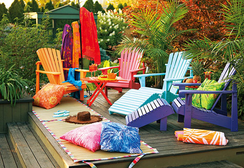 为了强调度假的愉快氛围,这个露台上的座椅被刷成紫、蓝、粉、橙等色,让人联想到海滨假日时佩戴的花环。也可以选择藤条或柳条编织的家具,一定给它们喷上鲜艳的色彩,来营造浓郁的假日气息。