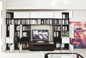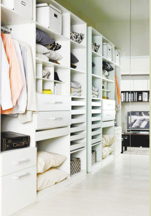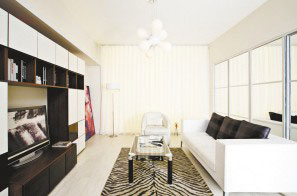客厅是人们的核心生活空间,因此必须具备多空间叠加及超强收纳功能。在科宝家装体验馆,海清曾见识到小面积客厅得到最大程度利用后,让人感觉空间增容了20%。方法很简单,这个客厅采取了镜面移门隔断设计。在卧室和客厅之间采用移门做隔断,首先从视觉上扩充了空间,当七八个朋友来做客时也不显拥挤,同时推拉之间可任意切换空间功能。另外,客厅有个超大容量影音储物柜,有了它,所有杂乱的小饰品或小物件都可被收纳进去,看起来干净整洁。