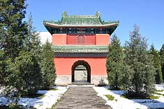 (2)“天门”,北天门为三券门式,通面阔22米,进深4.5米。朱红墙壁,歇山调大脊,单檐绿琉璃筒瓦,檐下彩绘旋子彩画,砖砌拨券门,木门饰九横九纵门钉。