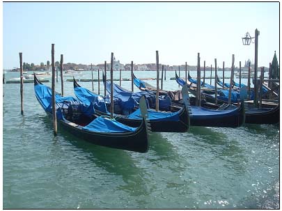 空载的贡多拉分量极轻,几乎是贴着水皮漂浮着,排列整齐地一一拴系在水桩上,整装待发。为了美化船只或是表示良好的祝愿,也为了能从众多的船只里很快识别自己的船只,艄公往往在船帮船头上装饰有鲜花或精致的雕塑,于是每只船又显出各自的特色来,在大同中表现出小异。