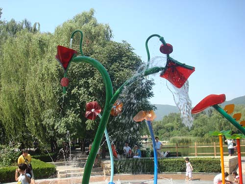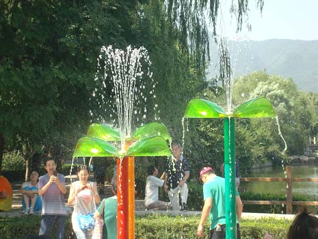 这里的喷头有多种样式。有“一冲向天”单调喷水的,有成丛成簇喷涌的,有涌出后沿“荷叶”流下的,有喷成“水蘑菇”的。水蘑菇比较和缓,水量较小,不必冒风险,所以聚集了不少大人小孩。