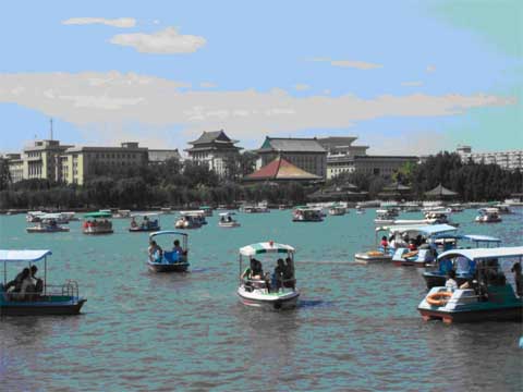 划船,一曲“让我们荡起双桨”,中国学生没有不向往的。白塔、绿树、红墙,说的是北海公园,其实那首歌是在昆明湖里创作的。如今湖上小船已“进化”为脚踏或电动。在长河,游船能从北京展览馆直达颐和园。往东,德胜门等处修了船闸,看样子,将来航船会去得更远。