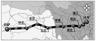 (1)川藏铁路起于成都,经蒲江、雅安、康定、理塘、左贡、波密、林芝到拉萨,全长1639公里,其中四川境内约650公里。2011年,川藏铁路被纳入“十二五”规划研究路段,川藏铁路建设被提上日程。因建设难度大于青藏铁路,川藏铁路被誉为第二条“天路”