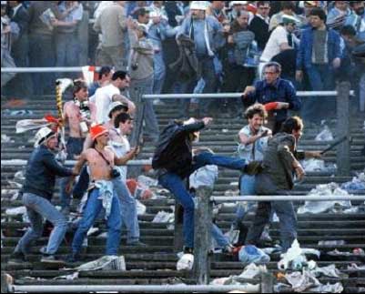 1985年5月29日,在比利时首都布鲁塞尔的海瑟尔体育场上,一场欧洲足球冠军杯比赛正在激烈地进行中。一方是英国利物浦队,另一方是意大利尤文图斯队。赛前,由于足球流氓的捣乱,看台上英国和意大利双方球迷的大规模混战,致使围墙倒塌,有38名意大利人和1名比利时人当场死亡,数百人受伤。当时手机尚未普及,运动员不知死伤详情,继续比赛。赛后,英国球队被罚5年停赛(利物浦队停赛7年),因此英国足球元气大伤。这起惨案是当时国际足坛最严重的球迷骚乱事件。