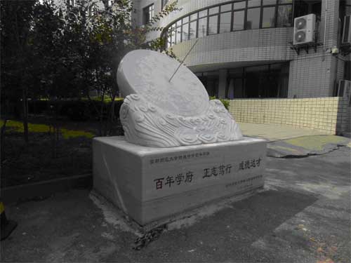 又过了五年,2014年夏季,北京一个普通的中学校,首都师范大学附属中学迎来了建校100周年的喜庆日子。学校收到校友和兄弟单位送来的许多礼物,其中最大也最显眼的是一座日晷。汉白玉的晷盘直径有120厘米,厚20厘米。晷盘上的时辰刻画十分清晰。虽然存在背面未注字,安装局促,忘了附时差修正曲线图表等通病,但是它标志着京城巨盘日晷方兴未艾。
