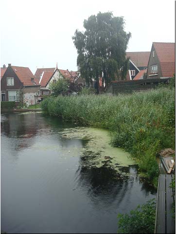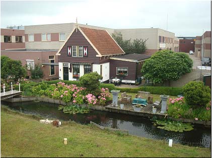 外国人对水的喜好却另类。曾见过荷兰一个依旁小河人家的庭院,最鲜明的特点是他们家的一切几乎都能让人看见,完全是一种开放式的布局。河面上长着不多的水生植物,几只小羊徜徉在对岸缓坡的草地上,河上横跨一座轻便的小桥。水面倒映着岸上的花草器物。住所周边没有很高的树木,却有鲜花环绕,连窗户上都挂着盛开花朵的花盆。灌木丛围成一道低矮的园界,近水边有一处休闲的“客厅”,木条拼搭起来的地面,避免了接地气的污浊和水泥地的冷硬,而且地面向河中挑出,别有风味。有几张宽绰的座椅,主人客人的座位都向河边敞开,铺着台布的桌面上,摆放着鲜花。临河的一边,高低错落放着几个栽种花草植物的瓷盆。或许因为荷兰纬度比较高,他们很喜欢阳光,所以客厅不带顶棚,不须遮阳,也不想避雨。而在中国,有“冬日可爱”、“夏日可畏”之说,雨水又多,亭台楼阁几乎都要有顶子,甚至连过河的一座桥也加篷,作成遮阳避雨的“风雨廊桥”,当然也成了一道风景。