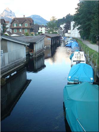 在瑞士,距离琉森湖往北半小时车程,有一个小村庄,依山傍水,水陆交通十分便利。人们比较富裕,多数人家有车,还有船。在濒临公路的河道里,岸边有拴船的桩柱,依次停泊着小艇,休闲的小艇上罩着淡蓝色的布罩。更小一些的船只,则驶进船坞,一应维修的工具、娱乐用品也存在那里。小河通向大河和湖泊,直到美丽的琉森湖。这与家家枕河的苏州有相似之处,但是更加宽敞,现代化一些。