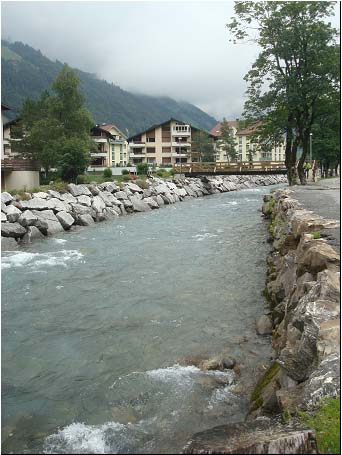 在瑞士,雪山脚下的一个村子,夏季积雪融化,河水冰凉,水流湍急,大石块护岸,在这里就别想划船、游泳、钓鱼等美事啦。这又叫人想起西藏拉萨河边或者新疆玛纳斯河边的某些村落、场院。