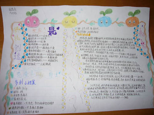 其中,《世界之最》介绍了世界上最长的河流是尼罗河,最咸的海是红海,最古老的海是地中海,最大的沙漠是撒哈拉沙漠等科普性知识;并简单介绍了世界上最纯净的瀑布是九寨沟瀑布,最长的跨海大桥是中国杭州湾跨海大桥,海拔最高的铁路是青藏铁路,世界上智商最高的人是玛莉莲莎凡。二班中,作者用了一整版来介绍世界上第一只克隆羊——多利的一生,介绍了多利的出生和成长故事,丰富了报纸的内容。