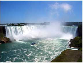 尼亚加拉巨大的水流十之八九流向加拿大马蹄形瀑布,所以,这边的瀑布最为壮观,1160米长的瀑布,如同银河倒泻,浪花飞溅,水沫横空,浓雾弥天,一股巨大的白色水浪在浓雾中翻腾奔涌,瀑布的咆哮呼啸声在数公里之外即清晰可闻。因此,在很久以前,当地的印第安人就给它取了一个极富神奇色彩的名字---尼亚加拉,意思是“雷神之水”