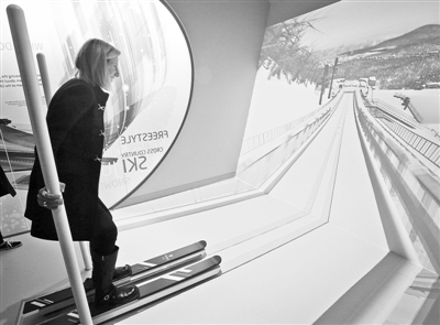 11月21日,位于温哥华地区里士满市的奥运体验博物馆首次开放。该馆是由国际奥委会批准成立的北美第一家奥林匹克专题博物馆,也是国际奥林匹克博物馆联盟的成员之一。图为市民在奥运体验博物馆内体验高台跳雪项目。新华社发(梁森摄)