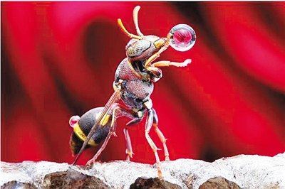 近日,一张胡蜂吸吮水珠,并用前足保持平衡的图片吸引了许多网友的关注。乍看之下,这只胡蜂似乎正在“吹泡泡”,而它吹出的水珠恰好映照出一朵玫瑰花,充满了美感。