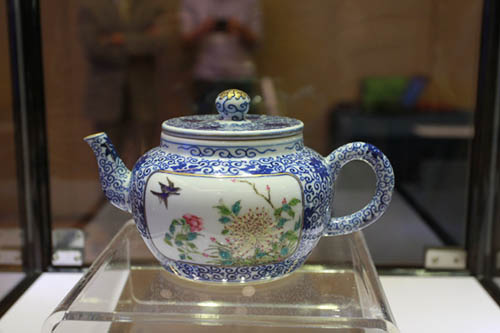 清乾隆粉彩青花开光花鸟纹描金茶壶