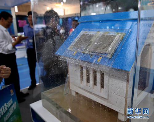 5月20日在北京民族文化宫科技周活动主场展厅拍摄的一款利用纳米薄膜雨水发电技术的小木屋。该木屋能实现下雨时发电、不下雨时用太阳能发电。