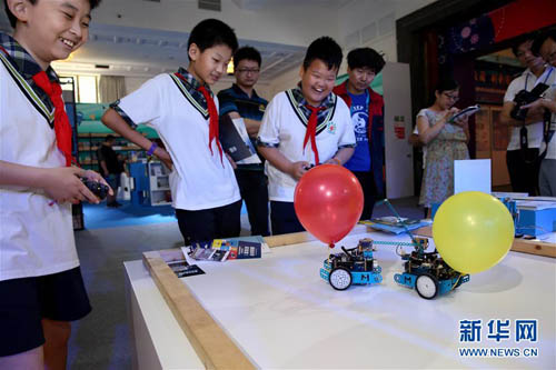 5月20日,在北京民族文化宫科技周活动主场展厅,几名学生在遥控机器人戳气球。