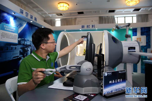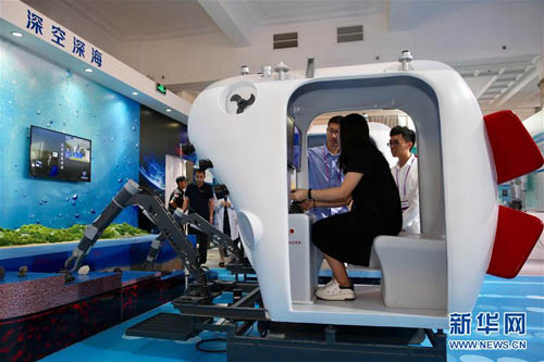 5月20日,在北京民族文化宫科技周活动主场展厅,参观者体验利用“蛟龙”号使用的机械臂抓取物品。