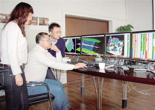 黄大年(左二)带领科研团队成员研究问题(2010年11月22日摄)。新华社发