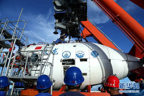 6月11日,“蛟龙”号载人潜水器即将入水,开始中国大洋38航次第三航段第9次下潜。