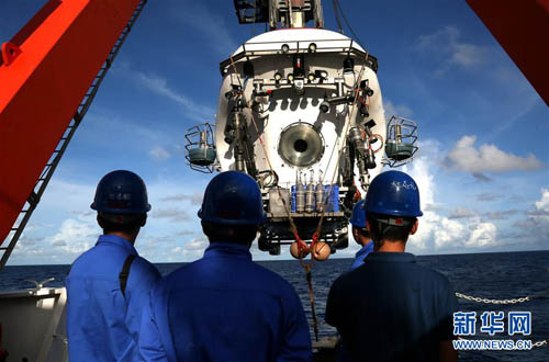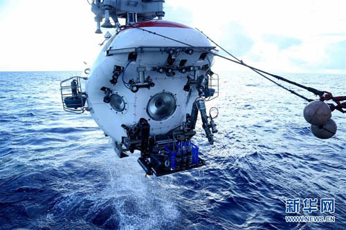 6月11日,“蛟龙”号载人潜水器离开水面,准备回到船上甲板。