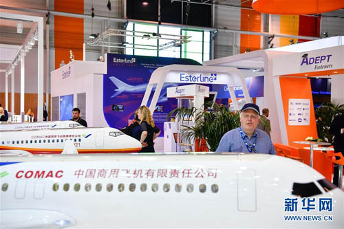 6月19日,在法国巴黎近郊的布尔歇,来宾参观中国商用飞机有限责任公司展位。