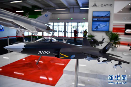 这是6月19日在法国巴黎近郊布尔歇拍摄的中国航空工业集团公司展出的中国第四代多用途隐身战斗机“鹘鹰”模型。