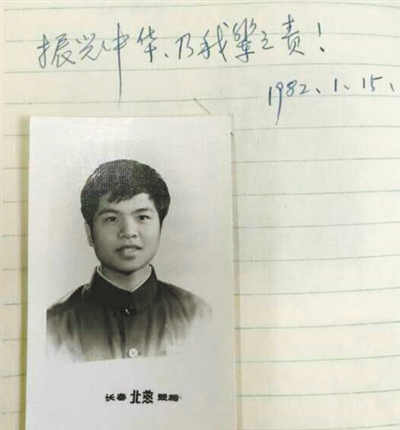 那是一张一寸黑白证件照,24岁的黄大年,一头浓密黑发,目光坚毅,俊朗的脸庞充满朝气。照片上方,有一句赠言简短有力:“振兴中华,乃我辈之责!”