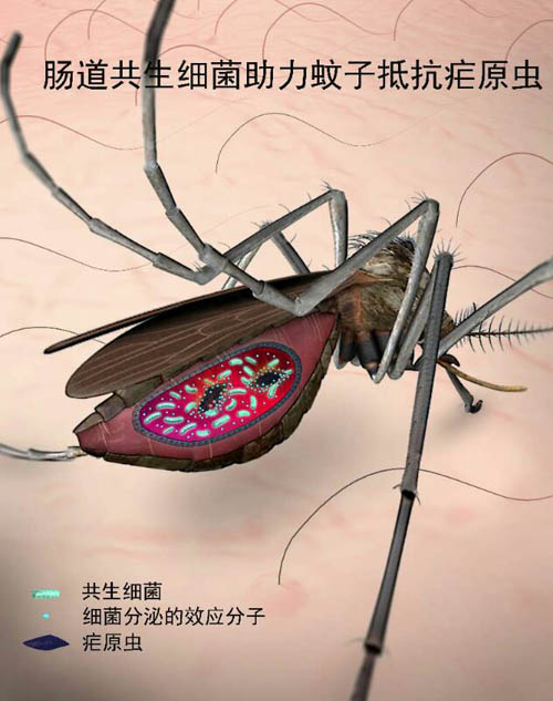 (图片说明:中科院上海植生生态所等发现能在按蚊中进行持续跨代传播的新共生细菌,能高效驱动抗疟效应分子快速散播到整个蚊群中,使按蚊成为无效的疟疾媒介,实现从源头上阻断疟疾传播。)