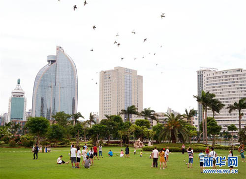 9月2日,市民和游客在厦门白鹭洲公园内观赏飞翔的鸽群。