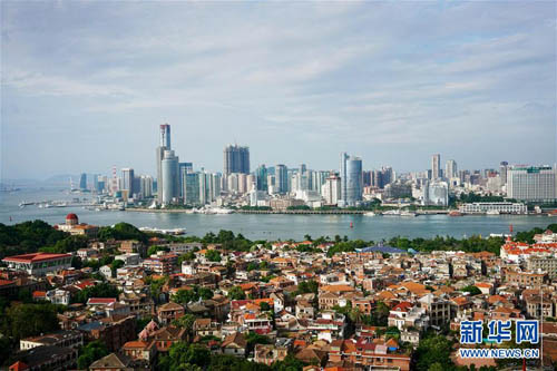 从鼓浪屿远望厦门岛,历史与现代建筑交相辉映(9月1日摄)。