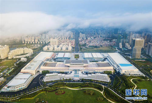 这是晨曦中的厦门国际会展中心(8月24日摄)。