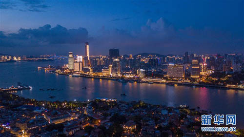 鼓浪屿(左下)与厦门岛的灯火在夜色中交相辉映(8月24日摄)。