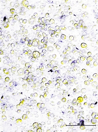 纺锤状的脂肪前体细胞在接受了灰尘提取物的处理后,形状变得更圆。蓝色(DNA)标记变多表明细胞数量增多,黄色脂质染色显示的是脂肪。我们可以观察到处在各个发展阶段的细胞——有些黄色脂质基本上已经占据整个细胞空间。