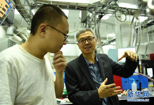杨学明(右)在实验室与自己的学生交流(8月26日摄)。新华社记者 李钢 摄